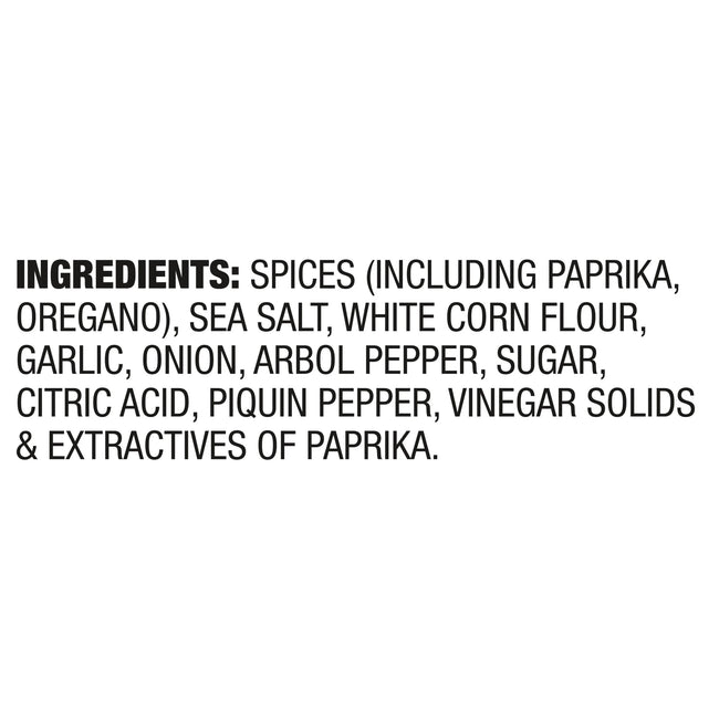 SPICES (INCLUDING PAPRIKA, OREGANO), SEA SALT, WHITE CORN FLOUR, GARLIC, ONION, ARBOL PEPPER, SUGAR, CITRIC ACID, PIQUIN PEPPER, VINEGAR SOLIDS & EXTRACTIVES OF PAPRIKA./div>