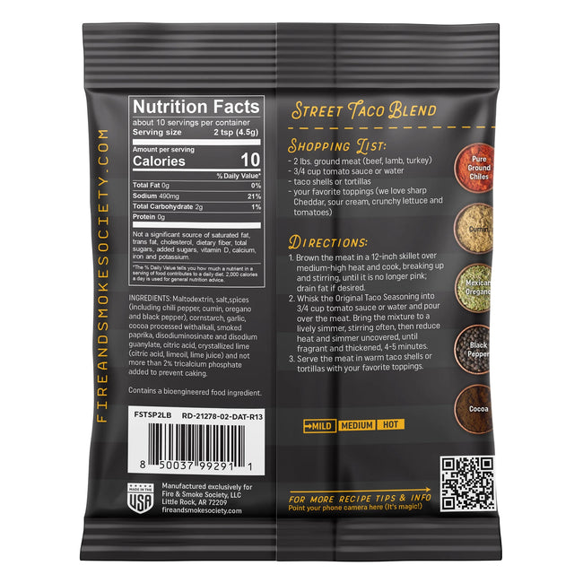 Get ready to elevate your Mexican cuisine game with our taco meat seasoning blend. Whether you're making tacos, fajitas, or chili our taco seasoning has got you covered. Our Mexican barbecue seasoning is made from pure ground chiles, cumin, Mexican oregano, and a pinch of cinnamon and cocoa. Each ingredient comes together to create a rich and complex flavor profile that will make your taste buds dance with joy. And the best part? Our blend is MSG-free, gluten-free, Fat Free and contains No Artificial Ingredients, making it a healthy choice for those with dietary restrictions. Mexican spices and seasonings are versatile and taste great on a variety of dishes, from classic tacos to flank steak, to chicken rub and chicken seasoning. Add this seasoning to your taco shells and taco sauce to complete your taco night kit. Que Rico! So if you're looking to add some authentic Mexican spice flavor to your dishes, look no further than our Mexican blend seasoning. It's the perfect blend of spices to take your Mexican cuisine to the next level.