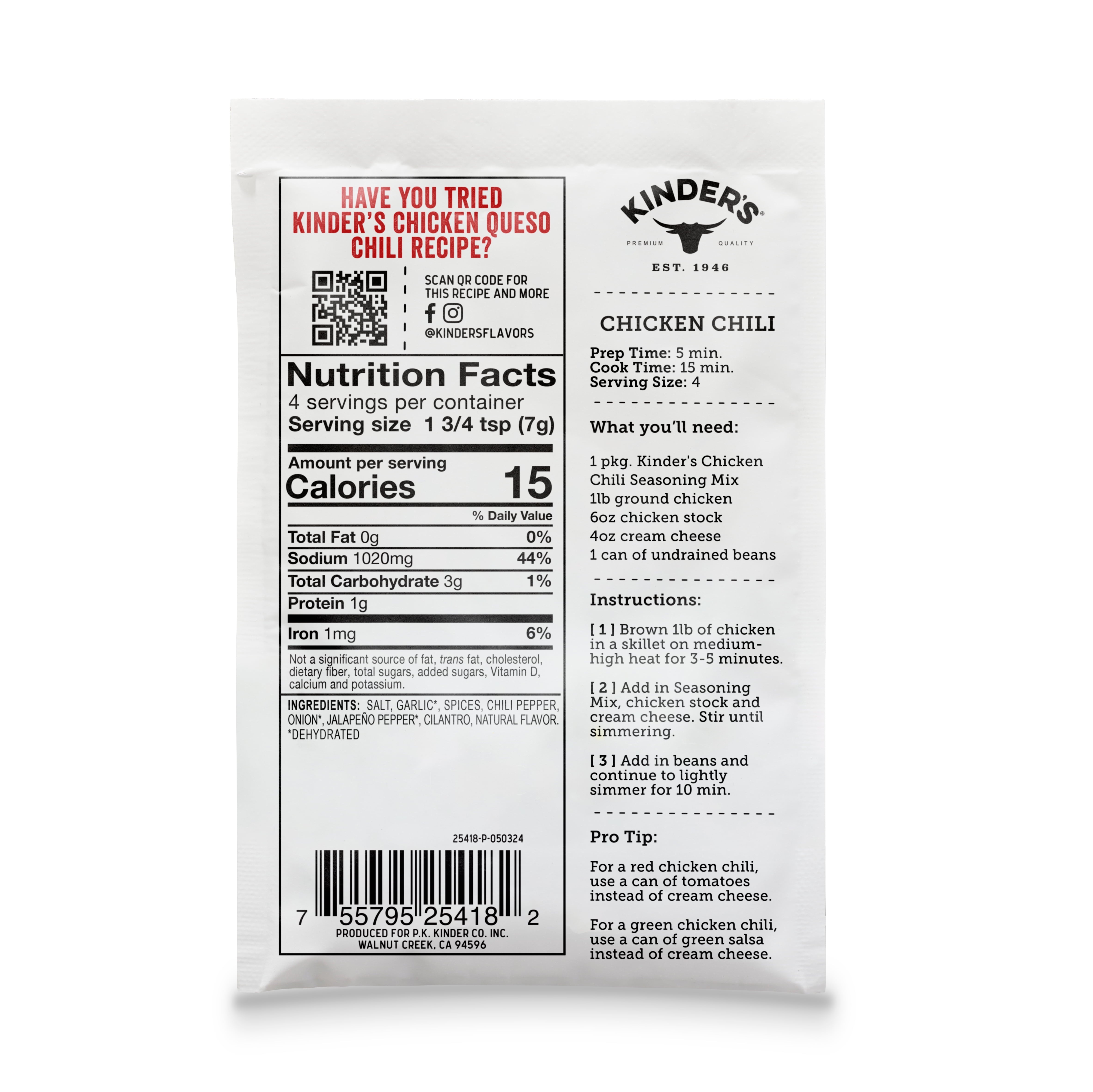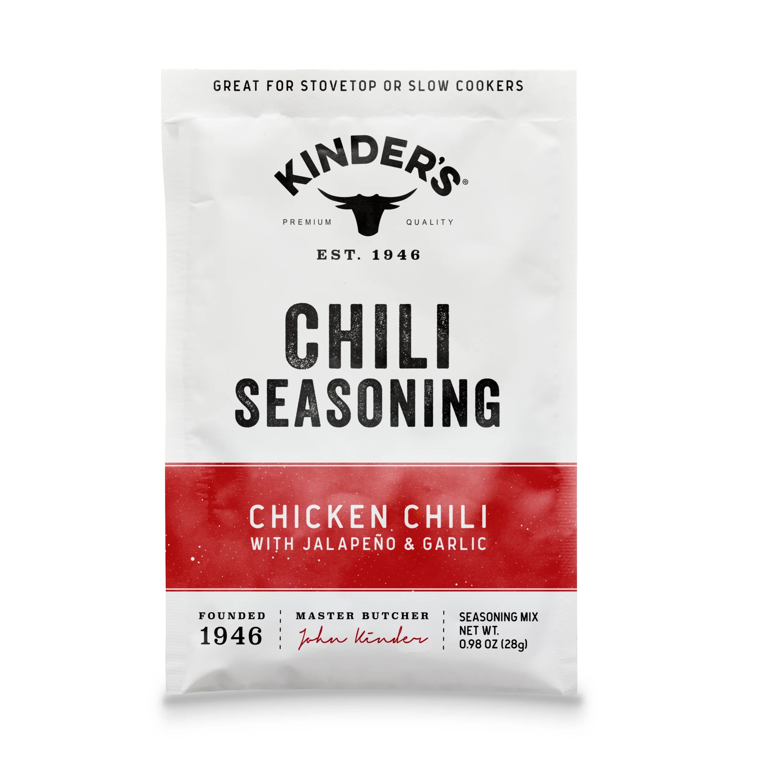 Kinder’s Chicken Chili Seasoning is a twist on our classic chili seasoning that was made to be the perfect match for chicken. We combine a rich blend of chilis, onions, garlic, and spices for a bold flavor that we think they’re going to love. Try it with white beans and a bit for cream cheese for our signature white chicken chili. Or combine it with crushed tomatoes for a hearty, classic chili. Either way, you can’t go wrong and dinner will be ready in minutes. We can’t wait for you to try it.