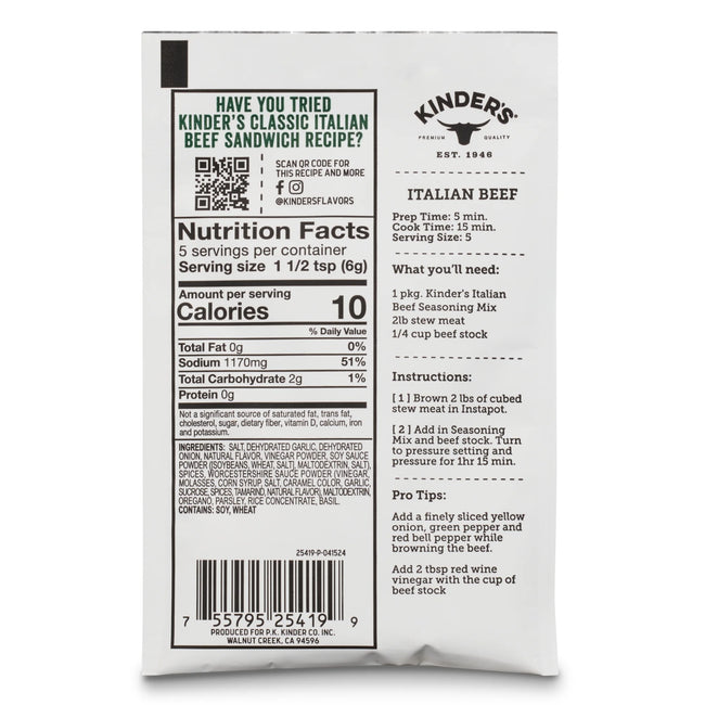 Kinder’s new Italian Beef Seasoning was inspired by the Chicago classic dish with tender beef and sweet peppers. It is a blend of garlic, onion, peppers, sea salt, and spices that will help turn your humble beef into a savory, tender crowd-pleaser. Our simple recipe makes it easy to get that rich Italian beef flavor whether you use the Instant Pot or want to go low-and-slow using the stovetop, slow cooker, or oven. Whether you serve it the classic style on a French roll or with mashed potatoes or polenta, we think your family and friends are going to have a new favorite. We can’t wait for you to try it.