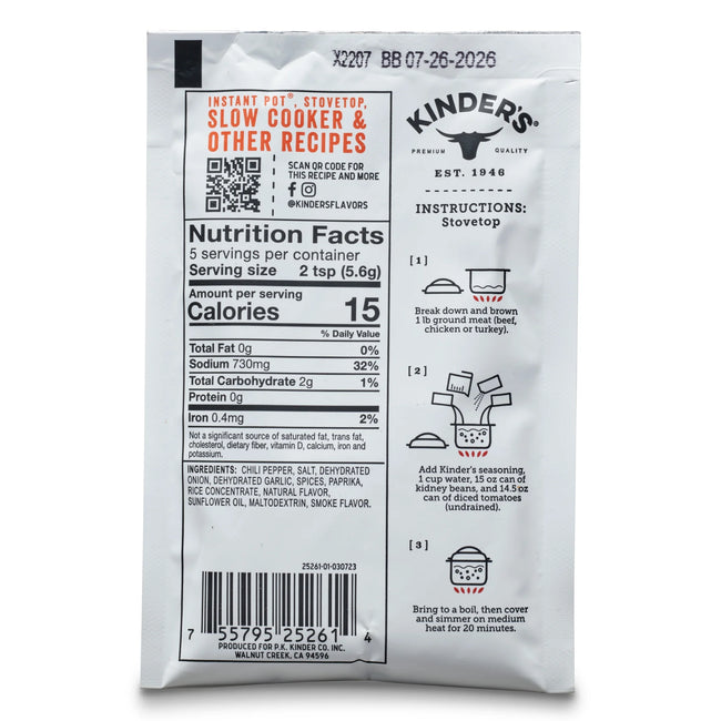 Kinder's Woodfired Chili Seasoning is a dry seasoning that adds the perfect flavor to a variety of slow cooker and instant pot recipes, including chili dishes, soups, stews, rice and beans, and more! This smoky chili seasoning is great for elevating a weeknight meal or your next chili cookoff. Light up the stove and get cooking with Kinder's Woodfired Chili Seasoning at your next friends and family gathering.