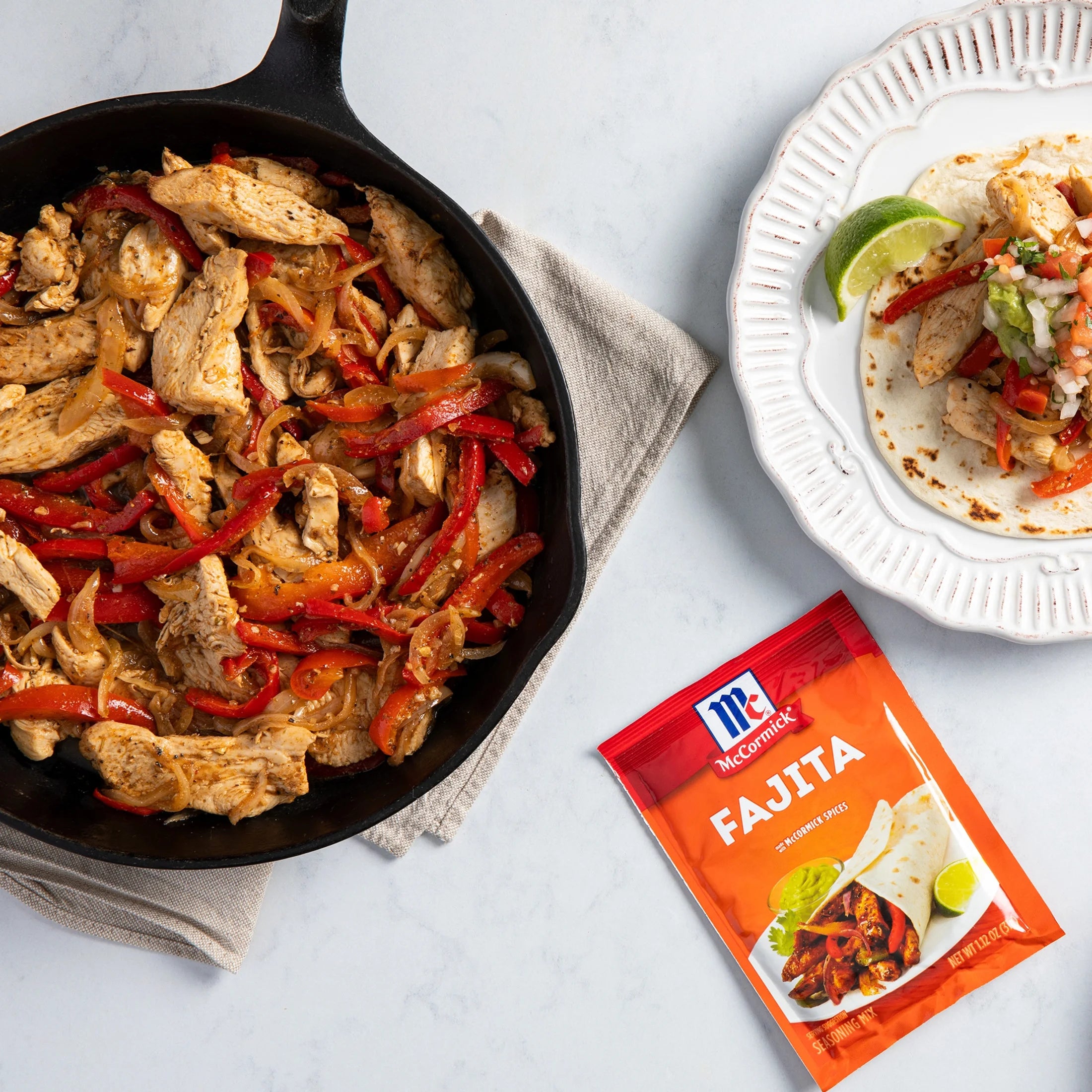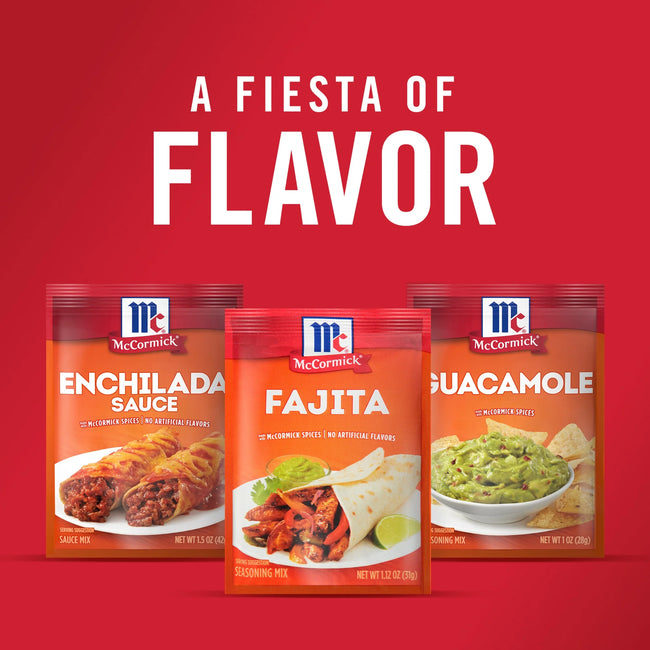 McCormick Fajita Seasoning Mix, 1.12 oz Envelope. For easy, restaurant-style fajitas at home, reach for McCormick Fajitas Seasoning Mix. A vibrant combination of cumin, chili peppers, garlic, and a hint of lime juice, it infuses steak, chicken, and veggies with southwestern-inspired flavor in minutes. Whether you’re looking for a family-friendly meal or dining solo, this convenient seasoning mix is the solution. Combine one packet with one pound of meat and prepare on the stovetop. From there you can fill warm tortillas for chicken fajitas, beef fajitas, or even shrimp fajitas, and top with everything from shredded lettuce to guacamole, avocado slices, chopped tomatoes, sour cream, and salsa. Or use prepared fajita meat to prepare nachos or quesadillas for a fun twist. Welcome to the world of McCormick spices! From sweet to savory to spicy, we have all the flavors you need to elevate your next meal. With our wide variety of flavors to explore, your next favorite spice is always just around the corner. This McCormick Fajita Seasoning Mix is in a Paper packet that is 1.12 ounces. Store this shelf-stable item at an ambient temperature.