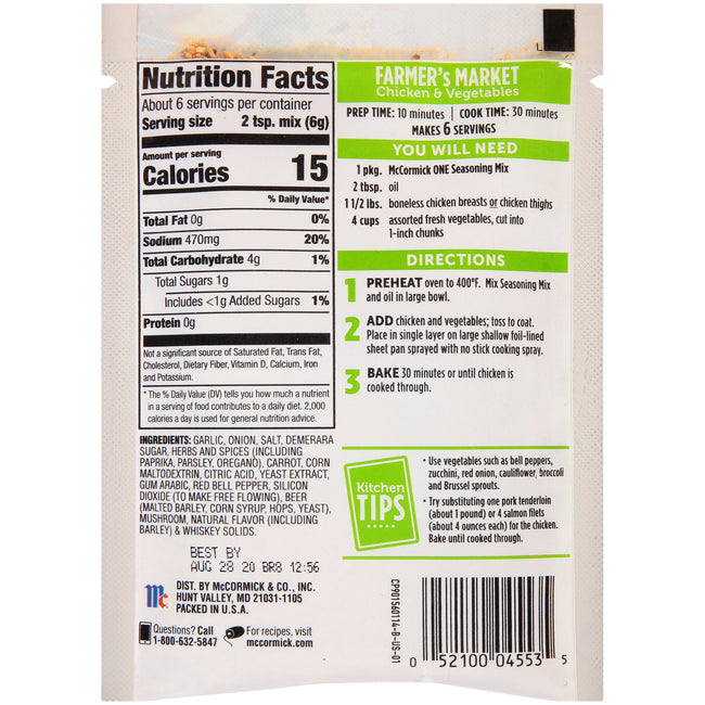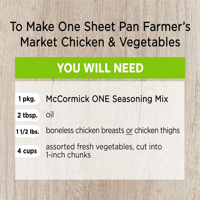 McCormick Farmer's Market Chicken & Vegetables One Sheet Pan Seasoning Mix, 1.25 oz Envelope. Highlight the best of the season’s produce with McCormick One Sheet Pan Farmer’s Market Chicken and Vegetables. This versatile seasoning mix plays well with whatever vegetables you have on hand, creating a simple, balanced and delicious meal in about 30 minutes with the added bonus of easy clean-up. In summer, prepare the seasoning mix with bell peppers and zucchini with chicken breast. For a heartier winter meal, you could substitute the chicken with pork and turn to Brussels sprouts and root vegetables such as carrots. The beauty of this mix is that it works well with a variety of ingredients, so as long as it’s in your pantry, you have dinner covered! To make this one-pan meal, you will need: McCormick ONE Seasoning Mix, oil, boneless chicken breasts or chicken thighs and assorted fresh vegetables. This McCormick Farmer's Market Chicken & Vegetables One Sheet Pan Seasoning Mix is in a Plastic packet that is 1.25 ounces. Store this shelf-stable item at an ambient temperature.