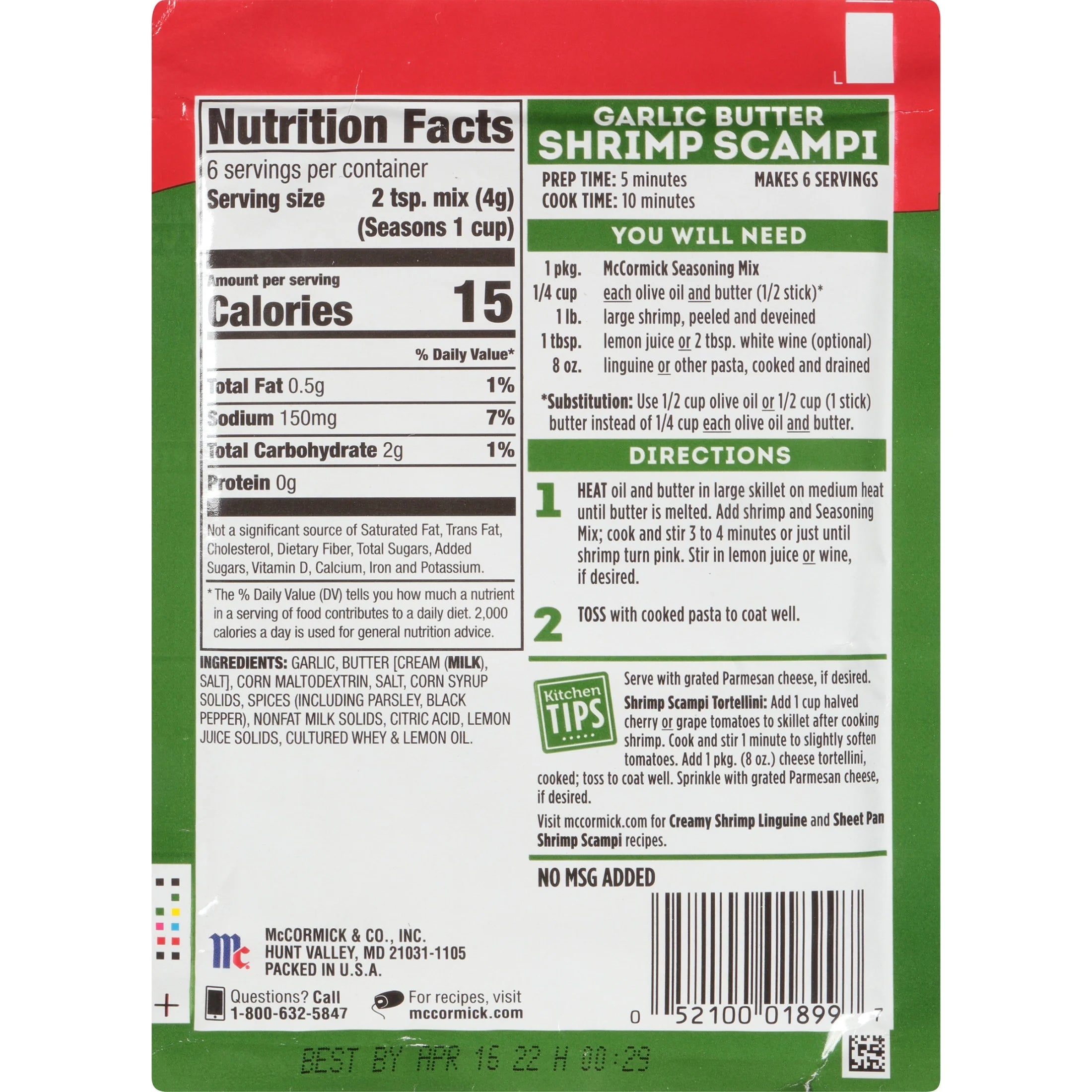 McCormick Garlic Butter Shrimp Scampi, 0.87 oz Envelope. McCormick Garlic Butter Shrimp Scampi Mix is perfect for turning pasta into an experience you and your family will savor to the last bite. Warm garlicky-buttery sauce with shrimp and linguine. Just like you'd get at a restaurant. Sauté shrimp with this recipe mix and butter, and toss with pasta. McCormick Garlic Butter Shrimp Scampi Mix is perfect for turning pasta into an experience you and your family will savor to the last bite. And it's ready in fifteen minutes, so you won't have to wait long to chow down! Sauté shrimp as your sauce simmers, then pour over your choice of pasta, combine with shrimp, and enjoy! Made with no artificial flavors or MSG, you can feel good serving this meal. For a mature twist on this tasty classic, add two tablespoons of white wine. This McCormick Garlic Butter Shrimp Scampi is in a Plastic packet that is 0.87 ounces. Store this shelf-stable item at an ambient temperature.