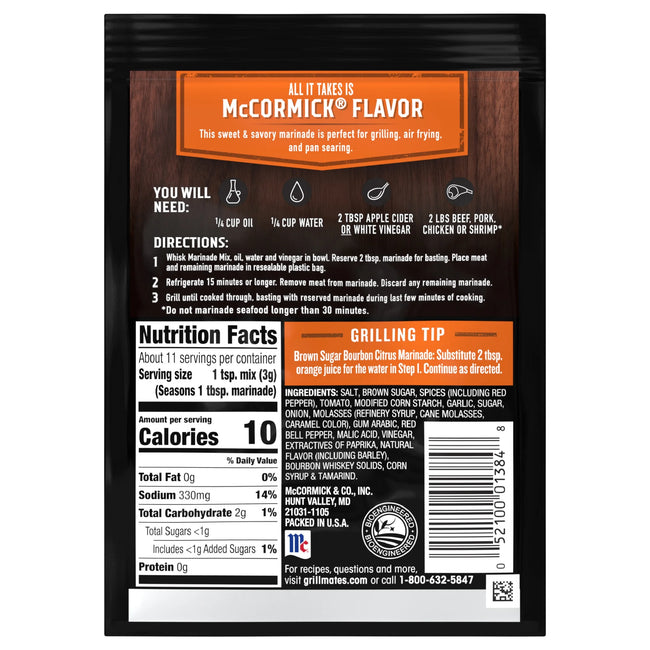 McCormick Grill Mates Gluten Free Brown Sugar Bourbon Marinade, 1.25 oz Envelope. Backyard barbecues just got juicier and more delicious with McCormick Grill Mates Brown Sugar Bourbon Marinade Seasoning Mix. This sweet marinade seasoning features a blend of brown sugar, bourbon and natural herbs and spices, like red pepper and garlic, that will keep your guests coming back for more! Simply combine one marinade packet with ¼ cup oil, 2 tablespoons water and apple cider or white vinegar with two pounds of chicken, beef, pork or shrimp, marinate, grill and enjoy a memorable, mouthwatering meal. This McCormick Grill Mates Brown Sugar Bourbon Marinade is in a Plastic packet that is 1.25 ounces. Store this shelf-stable item at an ambient temperature.