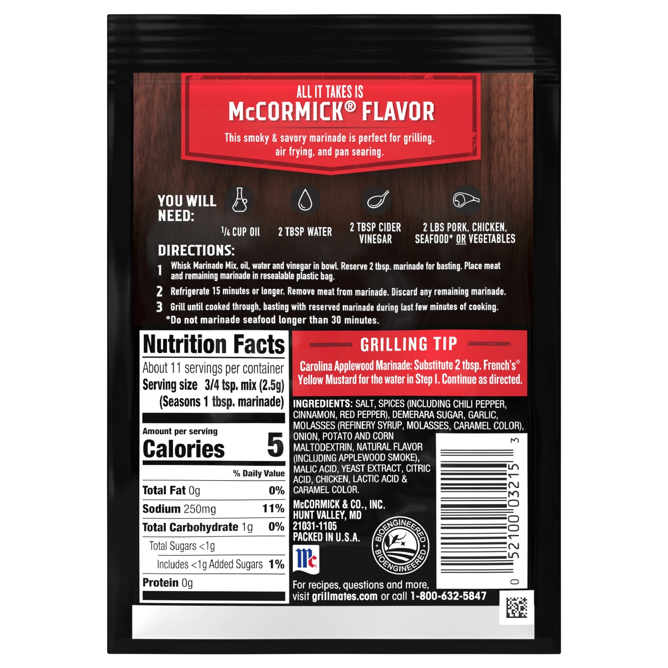 McCormick Grill Mates Gluten Free Smoky Applewood Marinade, 1 oz Envelope. For an easy marinade on seafood, beef, and pork, reach for this sweet and smoky blend of chili pepper, red pepper, garlic and applewood smoke flavor. Just add oil, water and vinegar, then marinade and baste. McCormick Grill Mates Smoky Applewood Marinade is your secret for unforgettable flavor. Ready for a twist? Use yellow mustard instead of water for Carolina style BBQ. This McCormick Grill Mates Smoky Applewood Marinade is in a Plastic packet that is 1 ounces. Store this shelf-stable item at an ambient temperature.