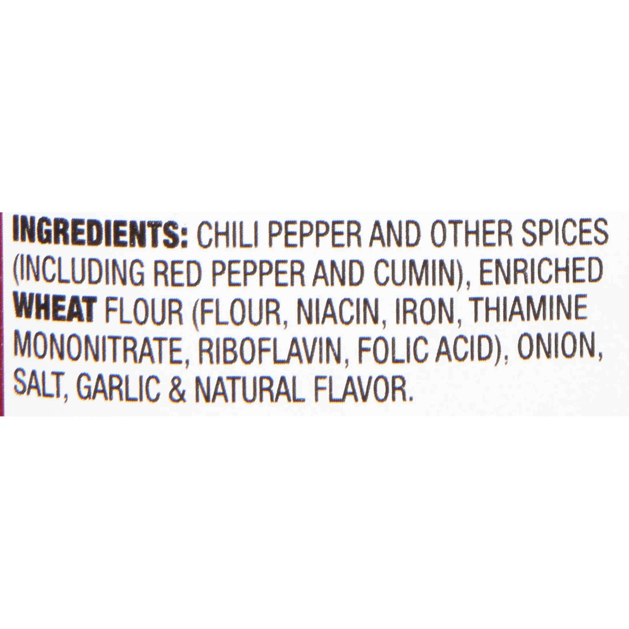 Chili Pepper and Other Spices (Including Red Pepper, Cumin), Enriched Wheat Flour (Flour, Niacin, Iron, Thiamine Mononitrate, Riboflavin, Folic Acid), Onion, Salt, Garlic, and Natural Flavor./div>