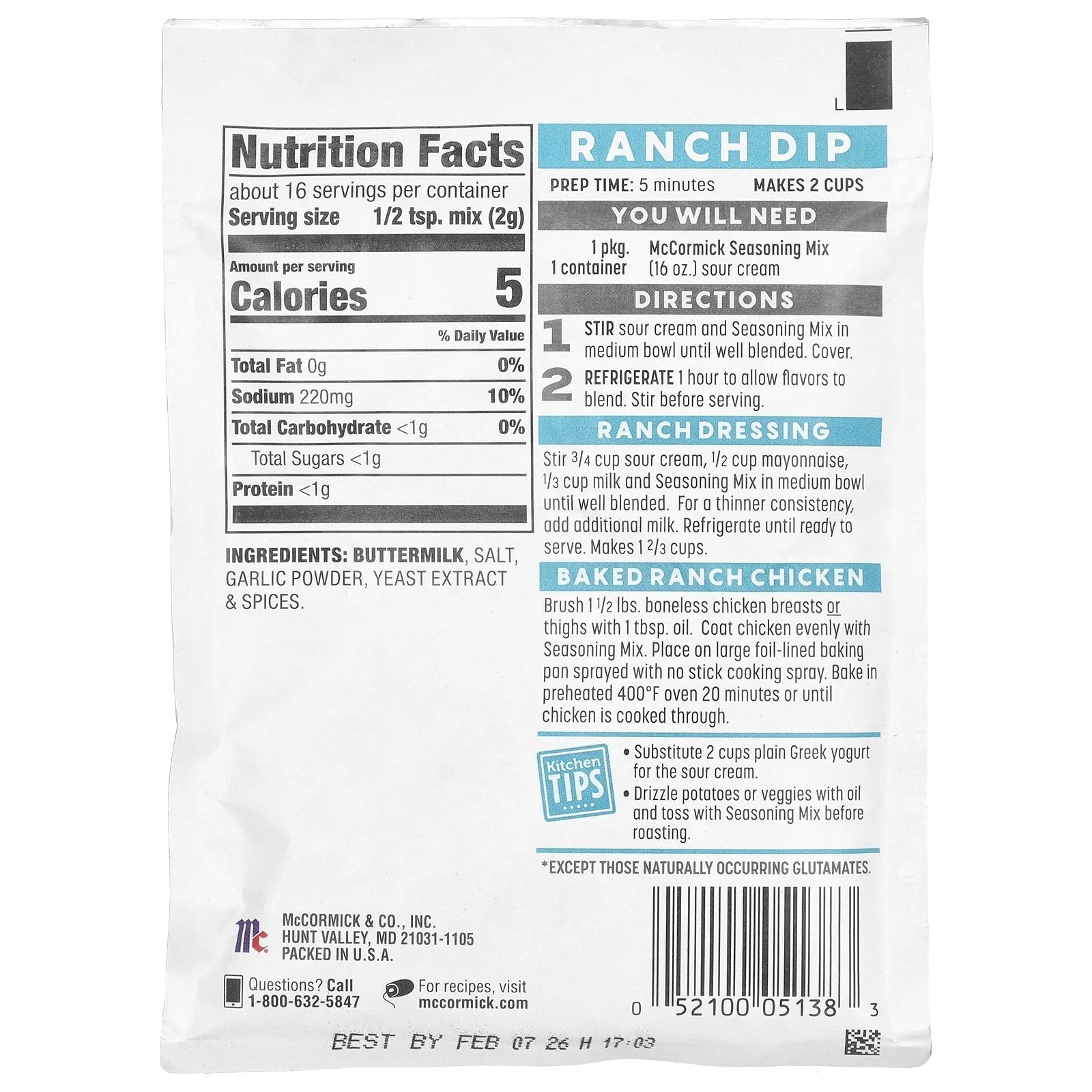 No Artificial Flavors No MSG Added* Gluten Free Just 5 simple ingredients- that’s the ingredient statement for McCormick Homestyle Ranch Dip, Dressing & Seasoning Mix. Use this versatile mix to prepare fresh-made ranch dip or dressing or to season roast chicken and potatoes deliciously. Our seasoning is gluten free and contains no artificial flavors or added MSG*, so you’ll feel good about keeping a few packets in your pantry. You can use it in so many ways. Make creamy ranch dip for fresh veggies or homemade ranch dressing for your greens or potato salad. At dinnertime, it delivers bold seasoning to meat and vegetables. With a clean label and pronounceable ingredients, you can trust that our ranch mix will create tasty dishes for your family. *Except those naturally occurring glutamates.