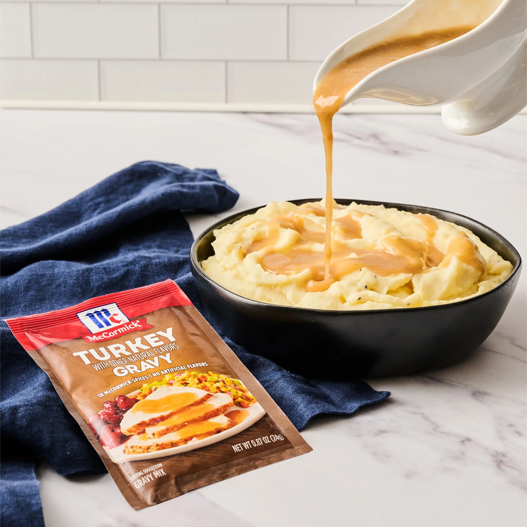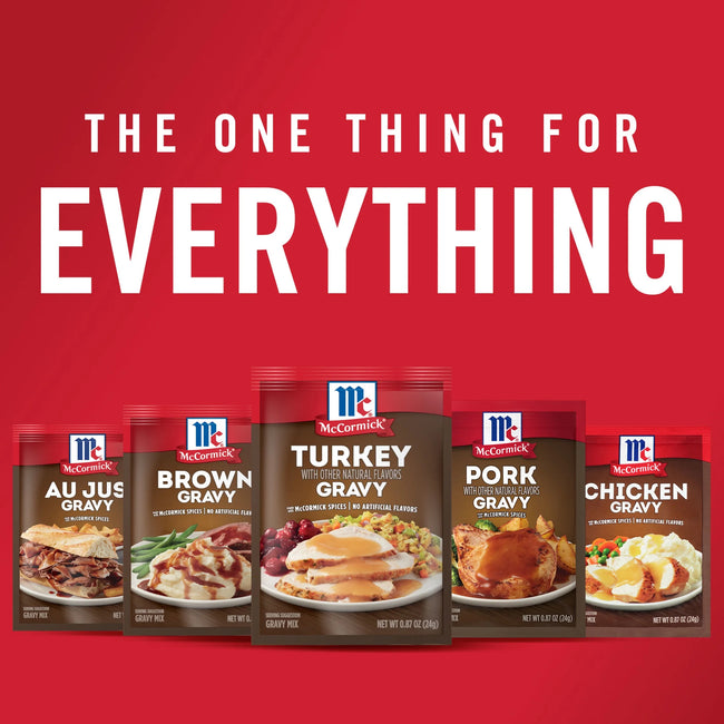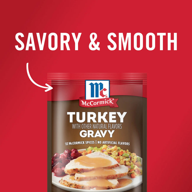 McCormick No Artificial Flavors Turkey Gravy Seasoning Mix, 0.87 oz Envelope. Create effortlessly savory gravy in minutes with McCormick Turkey Gravy Seasoning Mix. Our versatile blend is the perfect pantry staple for preparing everything from holiday gravy to weeknight meals. Made without added MSG (except those naturally occurring glutamates), or artificial flavors, McCormick Turkey Gravy Mix is full of flavor you can feel good about sharing with family and friends. Turkey Gravy Seasoning Mix is the ultimate stress-free holiday helper to prepare rich turkey gravy. Simply combine with 1 cup cold water, bring to a boil, and simmer for smooth gravy in just 5 minutes. Serve with roast turkey and chicken, classic sides like mashed potatoes and stuffing, or use as flavor base to create delicious meals out of leftovers― like pot pies, chicken divan, soups, and chicken and dumplings. Keep a stash of seasoning mix on hand for easy holiday gravy or use as a meal-starter for weeknight dinners. Whip up stovetop chicken and rice in a flash using leftover baked chicken and our seasoning mix to create a creamy, rich sauce. Toss prepared gravy with shredded rotisserie chicken and mound into baked potatoes for a simple supper. Make a filling for a homestyle pot pie with prepared gravy, leftover turkey, peas, carrots, and potatoes. The list of possibilities is endless when it comes to Turkey Gravy Seasoning Mix! This McCormick Turkey Gravy Seasoning Mix is in a Plastic packet that is 0.87 ounces. Store this shelf-stable item at an ambient temperature.