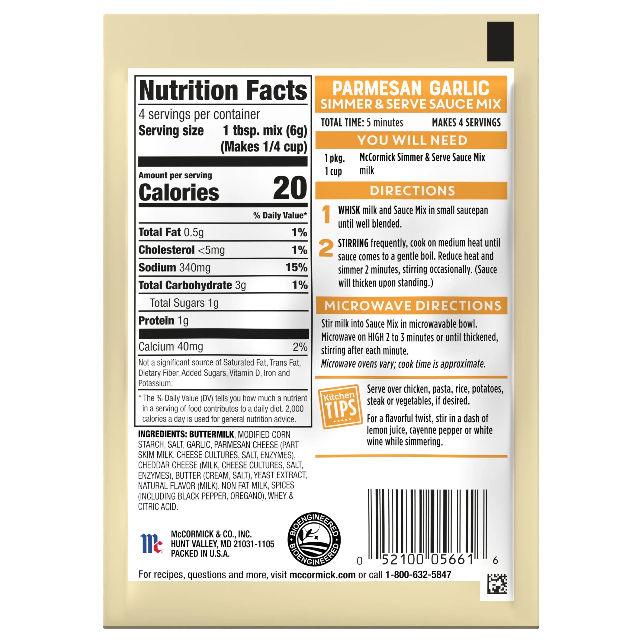 McCormick Parmesan Garlic Sauce Mix, 0.87 oz Envelope. McCormick Parmesan Garlic Sauce Mix helps you break out of your dinner rut with a sauce so versatile that it goes great over chicken, steak, pasta, rice, potatoes and veggies. This 5-minute sauce delivers the perfect finish to any meal. No special ingredients or long cooking needed with our Parmesan Garlic Sauce Mix. Simply whisk the sauce mix packet with 1 cup milk in a saucepan. Bring to a boil then simmer for 2 minutes. The result is 1 cup of sauce to serve over simply cooked entrees of poultry or meat. With its alfredo-inspired flavors of Parmesan cheese and garlic, it’s also delicious over shrimp or other seafood as well as kid-friendly spaghetti. Sometimes you all you need is a sauce to add flavor excitement to dinnertime. This McCormick Parmesan Garlic Sauce Mix is in a Paper packet that is 0.87 ounces. Store this shelf-stable item at an ambient temperature.