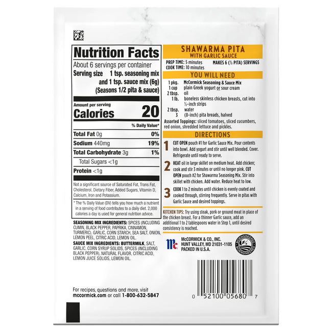 McCormick Shawarma Pita & Garlic Sauce Seasoning & Sauce Duo, 1.37 oz Envelope. McCormick Shawarma Pita with Garlic Seasoning & Sauce Mixes add international flavor to mealtime with a Middle Eastern style pita wrap filled with well-seasoned sautéed chicken strips, a creamy garlic sauce and fresh veggies. It’s easy to prepare and ready to serve in just 15 minutes. Introduce your family to new flavors with Seasoning & Sauce Duos, available in varieties that will appeal to everyone. Change it up with chicken shawarma pita for dinner tonight. To prepare, first make the garlic sauce by stirring the Sauce Mix into Greek yogurt or sour cream. Then sauté chicken strips with the Seasoning Mix for the filling. Serve the chicken in pita bread with the garlic sauce and assorted vegetables like tomatoes, cucumbers, red onion and lettuce. This McCormick Shawarma Pita & Garlic Sauce Seasoning & Sauce Duo is in a Paper packet that is 1.37 ounces. Store this shelf-stable item at an ambient temperature.