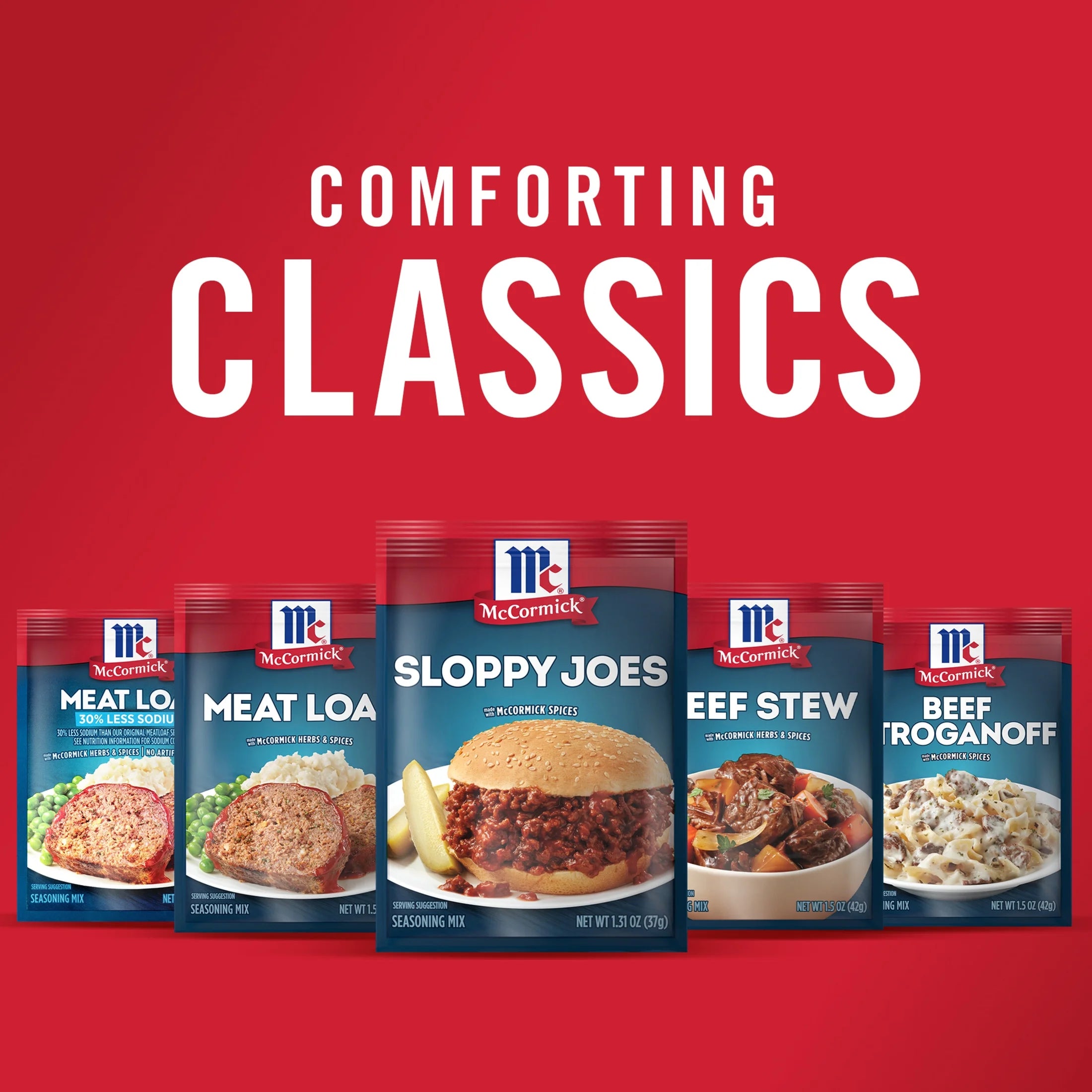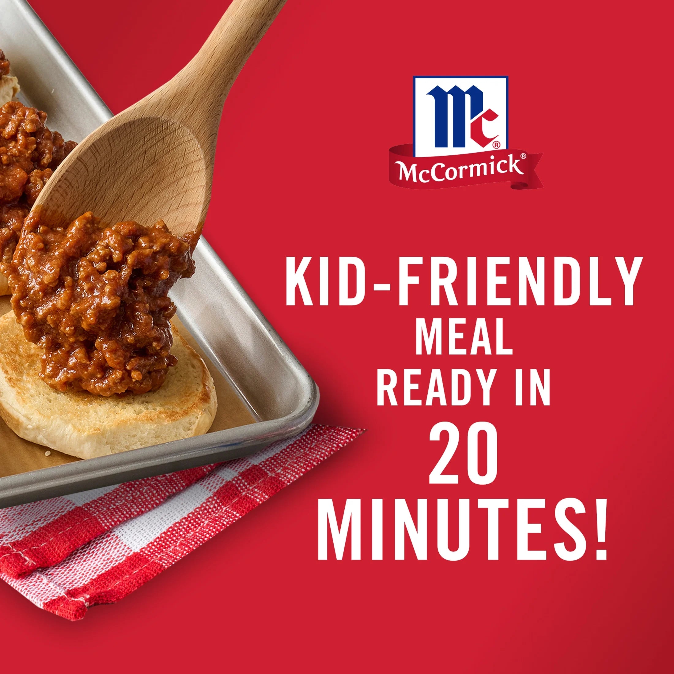 McCormick Sloppy Joes Seasoning Mix, 1.31 oz Envelope. Get classic comfort food on the table in just 20 minutes with McCormick Sloppy Joes Seasoning Mix. A delicious blend of spices like onion, garlic, paprika, and more, it adds signature Sloppy Joes flavor to ground meat for a memorable meal any night of the week. Whether you’re looking for a kid-friendly dinner or dining solo, this convenient seasoning mix is the solution. Combine one packet with ground meat, tomato paste, and water before simmering on the stovetop. From there, you can serve on pillowy hamburger buns for signature Sloppy Joes. Or prepare meat as directed and spread it over a pizza crust with cheese for a fun twist. It’s easy to prepare and gives your family endless options at the dinner table … Sloppy Joes meatball subs, Sloppy Joes nachos, Sloppy Joes dip, Sloppy Joes meatloaf … the list goes on! Welcome to the world of McCormick spices. From sweet to savory to spicy, we have all the flavors you need to elevate your next meal. With our wide variety of flavors to explore, your next favorite spice is always just around the corner. This McCormick Sloppy Joes Seasoning Mix is in a Paper packet that is 1.31 ounces. Store this shelf-stable item at an ambient temperature.