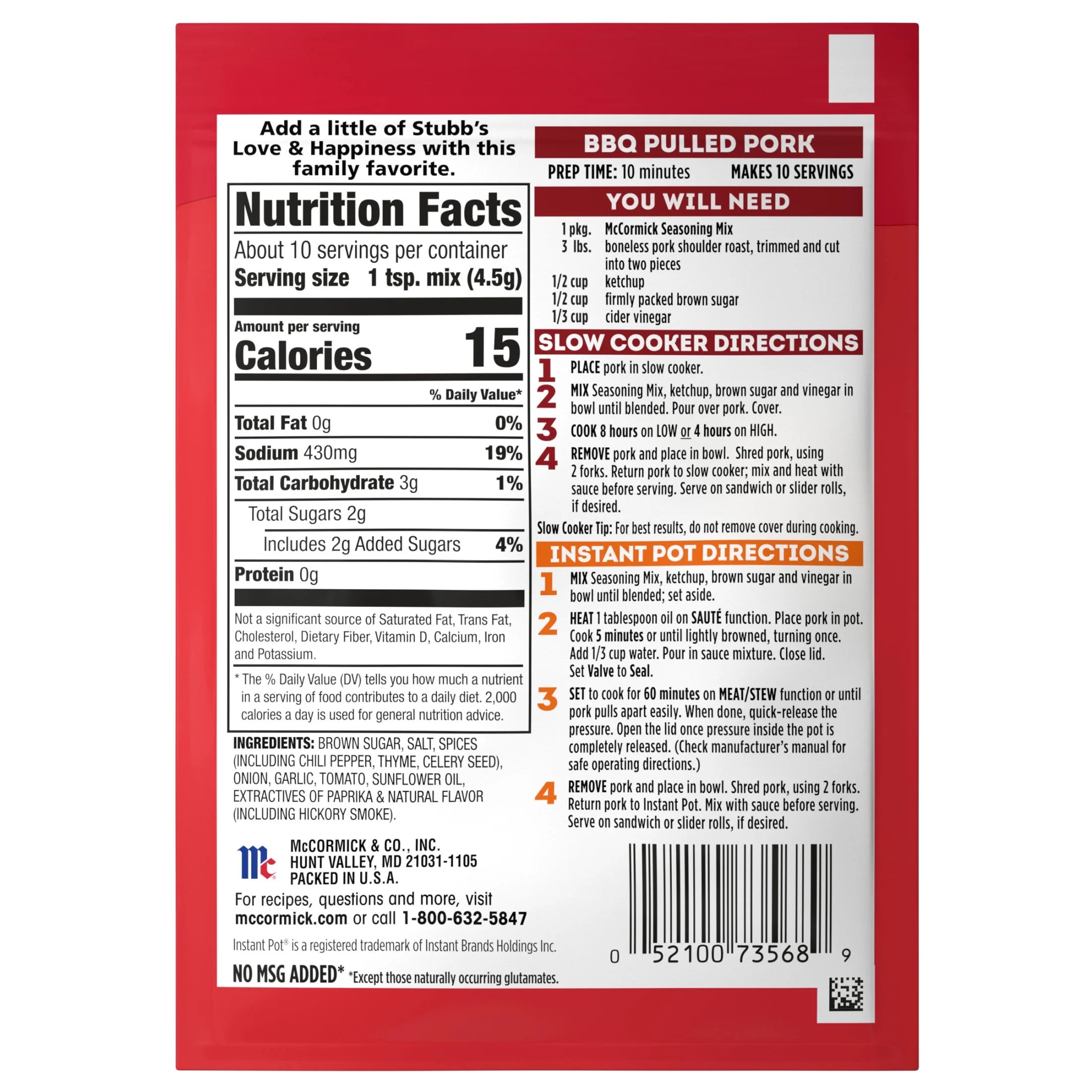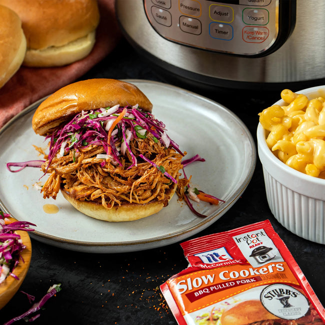 McCormick Slow Cooker Barbecue Pulled Pork Seasoning Mix, 1.6 oz Box. A sweet and tangy blend of brown sugar, garlic and chili pepper, McCormick Barbecue Pulled Pork Slow Cooker Seasoning Mix offers an easy-to-prepare meal solution in your slow cooker or Instant Pot any night of the week.Craving pulled pork sandwiches? The expertly blended seasoning mix makes it easy. Just add mix, ketchup, brown sugar and vinegar to your slow cooker or Instant Pot with pork. Then, sit back and let your meal simmer to perfection. The result? Juicy pork, so tender you can shred with a fork, perfect for piling high onto rolls, or enjoying on its own with your favorite sides. Dinner with McCormick Slow Cooker truly is a breeze: 8 hours on low, 4 hours on high in your slow cooker, or 60 minutes in your Instant Pot.*Except Those Naturally Occurring Glutamates. This McCormick Slow Cooker Barbecue Pulled Pork Seasoning Mix is in a Paper box that is 1.6 ounces. Store this shelf-stable item at an ambient temperature.