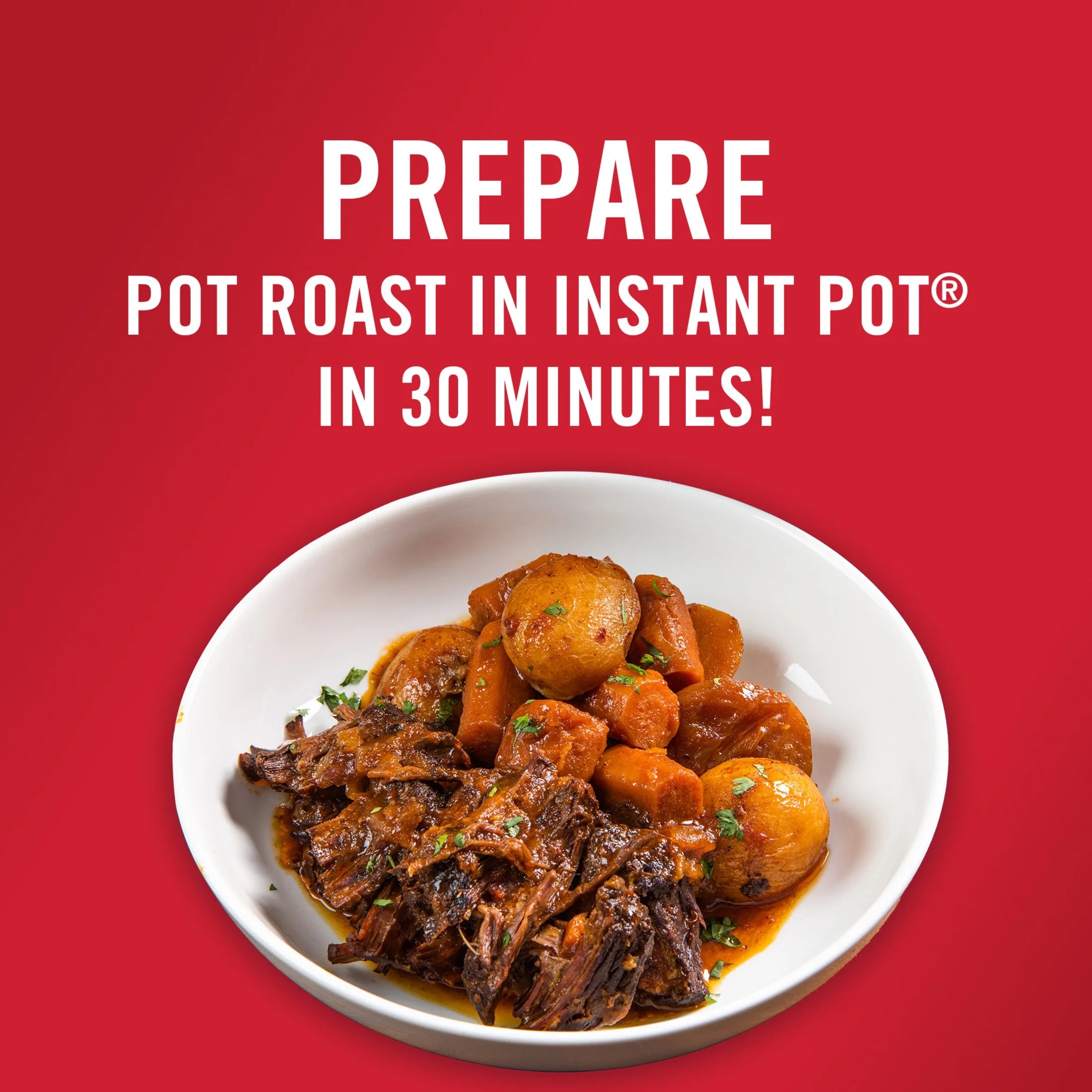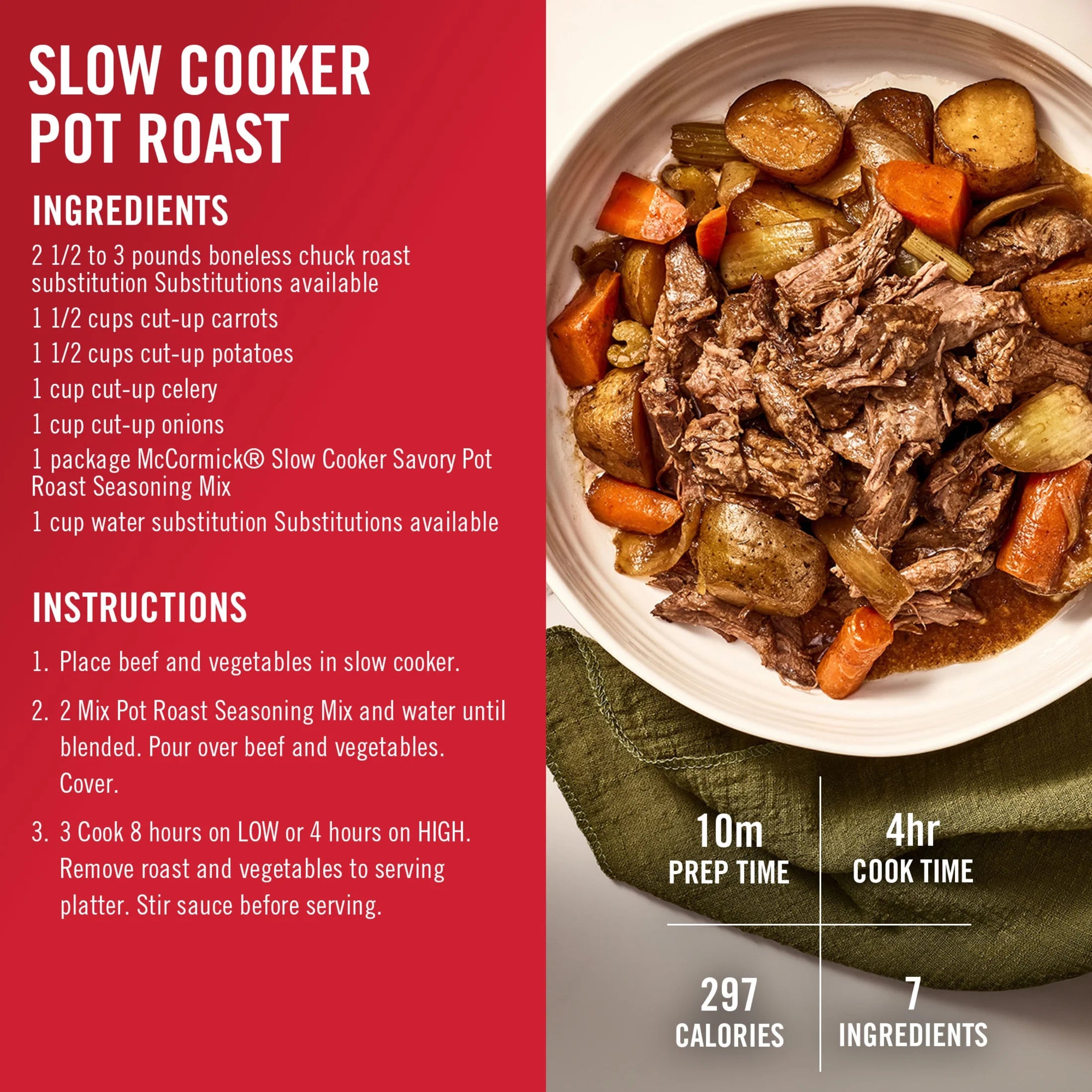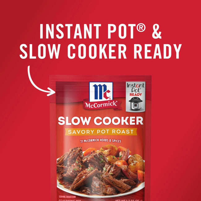 McCormick Slow Cooker Savory Pot Roast Seasoning Mix, 1.3 oz Envelope. McCormick Slow Cooker Savory Pot Roast Seasoning Mix offers an easy and convenient way to make a flavorful pot roast. Perfect for slow cookers and Instant Pots, this dry mix combines the perfect blend of herbs and spices to enhance your roast beef, brisket, or Sunday roast with rich, home-style flavor. Simply trim and put beef into the cooker, add chopped potatoes, carrots, celery, and onions, mix with water and seasoning mix, and let your cooker do the work. Whether you opt for the slow cooker 8 hours on low, 4 hours on high, or the Instant Pot 30-minute option, you'll enjoy a delicious and hearty meal any night of the week. Welcome to the world of McCormick spices! From sweet to savory to spicy, we have all the flavors you need to elevate your next meal. With our wide variety of ingredients to explore, your next favorite spice is always just around the corner. This McCormick Slow Cooker Savory Pot Roast Seasoning Mix is in a Paper packet that is 1.3 ounces. Store this shelf-stable item at an ambient temperature.