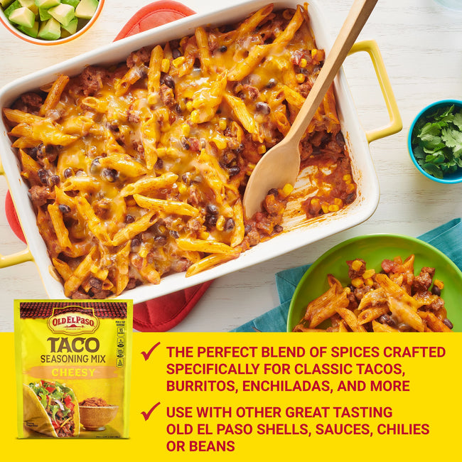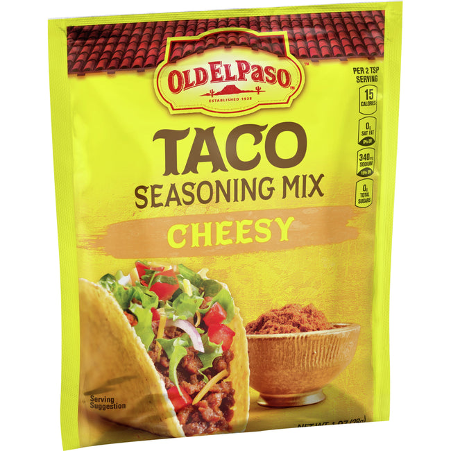 When you stock your pantry with Old El Paso Cheesy Taco Seasoning Mix packets, you're ready to celebrate taco night, every night. These great-tasting taco spices and seasonings help you get tacos on the table. Plus, you can use this seasoning to add bold flavor to meats, soups, dips and more. Enjoy the cheesy, spicy flavors of cheesy taco seasoning mix.For more than 80 years, Old El Paso has been bringing families and communities together to celebrate old and new traditions around delicious, Mexican-inspired flavors. We believe that any night can be a taco night, and we're here to help make it a little easier and a lot more delicious. Our variety of crispy hard taco shells, tasty soft tortillas, flavorful seasonings and much more help make taco night fun.