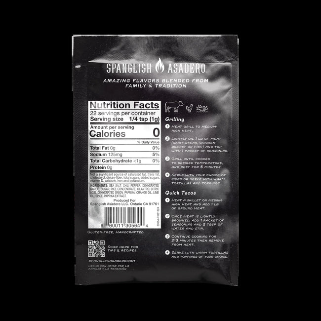 Our Carne Asada seasoning is inspired by authentic Mexican grilled steak with bold flavors and citrus notes. It’s made with a traditional blend of chilis, garlic, citrus and sea salt for a vibrant and bold seasoning - with a mild heat profile with a little kick of chili to keep you coming back for more. It's perfect for grilling skirt steak, chicken breast or fish and making tacos with ground meat. Serve with warm tortillas, toppings and sides of your choice for a deliciously authentic experience. About Spanglish Asadero: We believe that food is one of the most powerful forces in the world. Growing up, it not only nourished us, but it also connected us to our family and our heritage. It was the way our parents and grandparents showed us their love. We want everyone to have that power in their hands. To create amazing food that shows the people around them love and helps people feel the joy of being together and eating delicious food. We are here to craft amazing flavors that make it easy for people to have the authentic, Mexican-inspired flavors that we grew up with. Hecho con amor por la familia y la tradición.