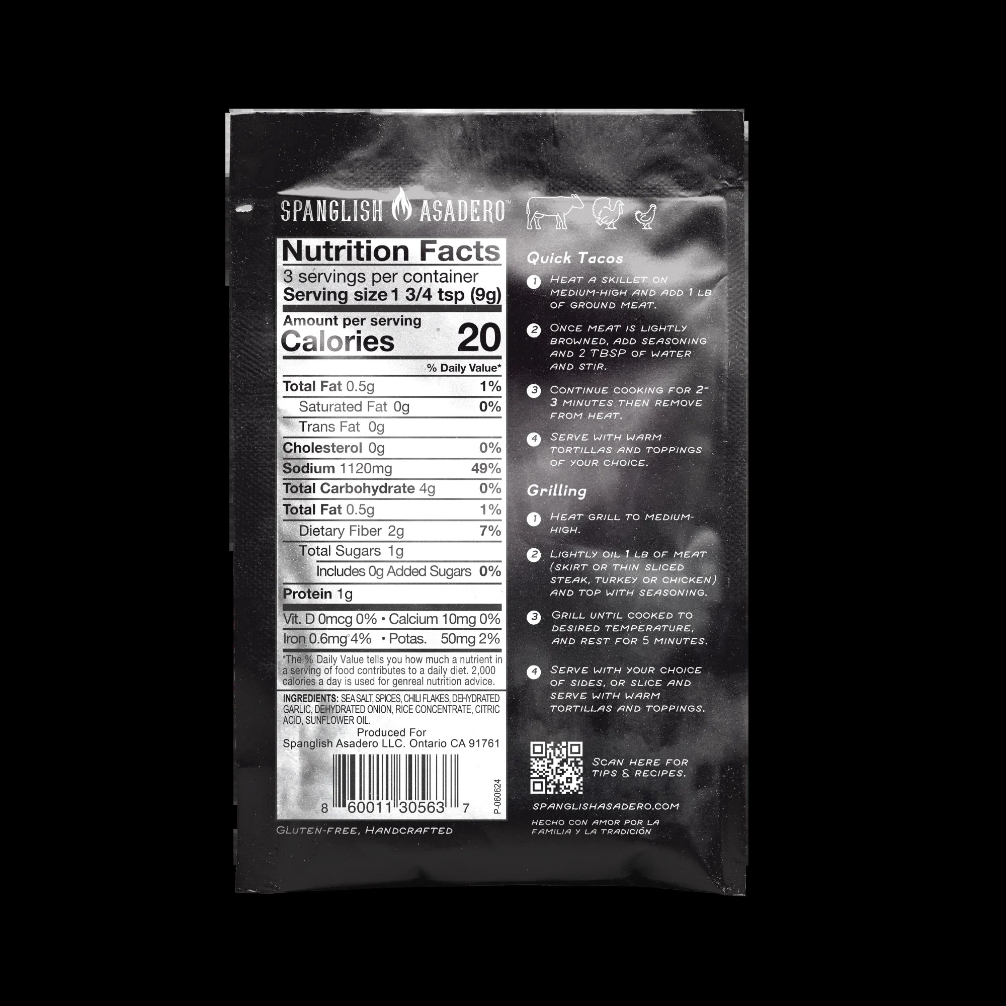 Our Taco seasoning is an authentic and bold take on the food what we all know and love. It’s made with a classic blend of chilis, garlic, spices and sea salt - with a mild heat profile with a little kick of chili to keep you coming back for more. It's perfect for making tacos with ground meat and grilling skirt steak or chicken breast. Serve with warm tortillas, toppings and sides of your choice for a deliciously authentic experience. About Spanglish Asadero: We believe that food is one of the most powerful forces in the world. Growing up, it not only nourished us, but it also connected us to our family and our heritage. It was the way our parents and grandparents showed us their love. We want everyone to have that power in their hands. To create amazing food that shows the people around them love and helps people feel the joy of being together and eating delicious food. We are here to craft amazing flavors that make it easy for people to have the authentic, Mexican-inspired flavors that we grew up with. Hecho con amor por la familia y la tradición.