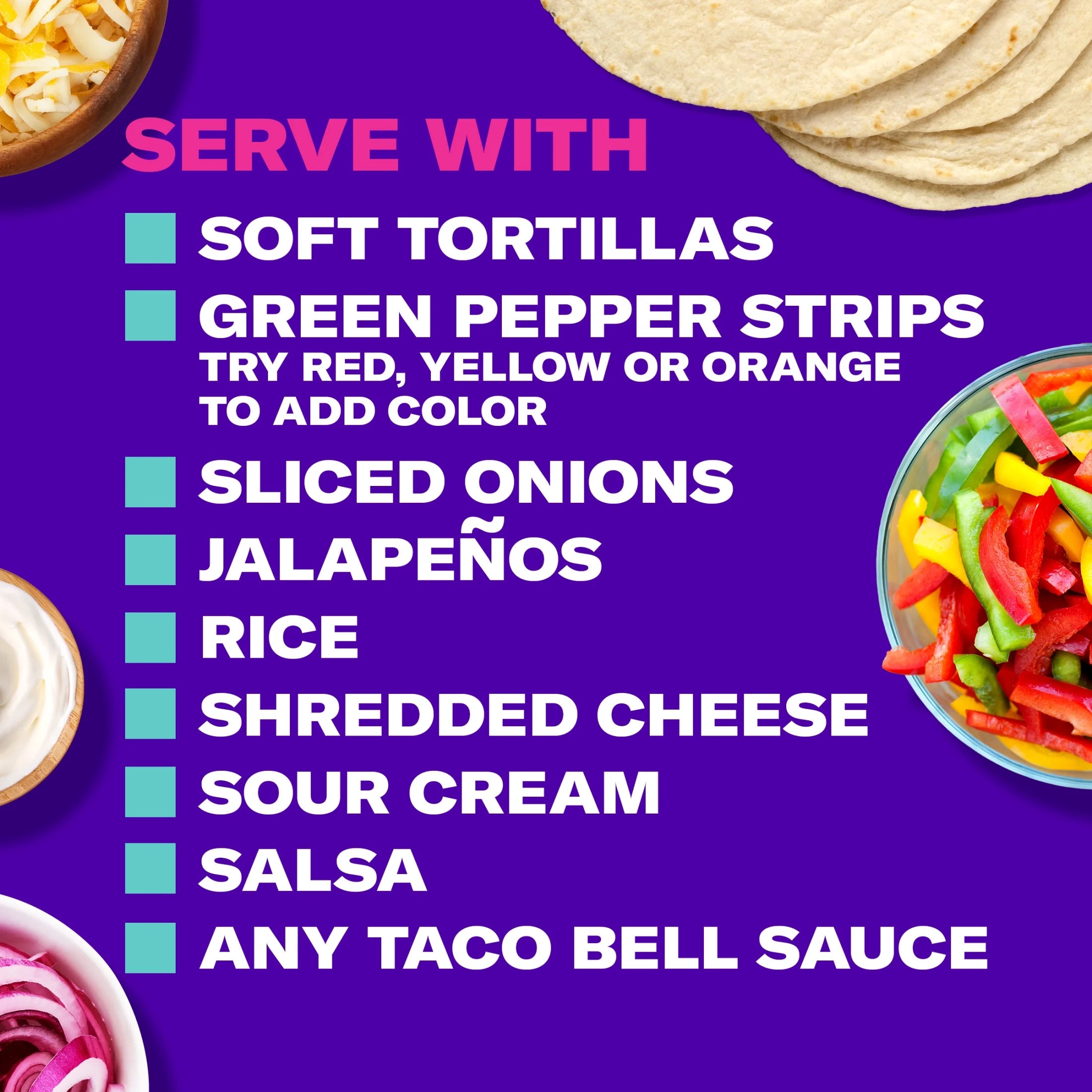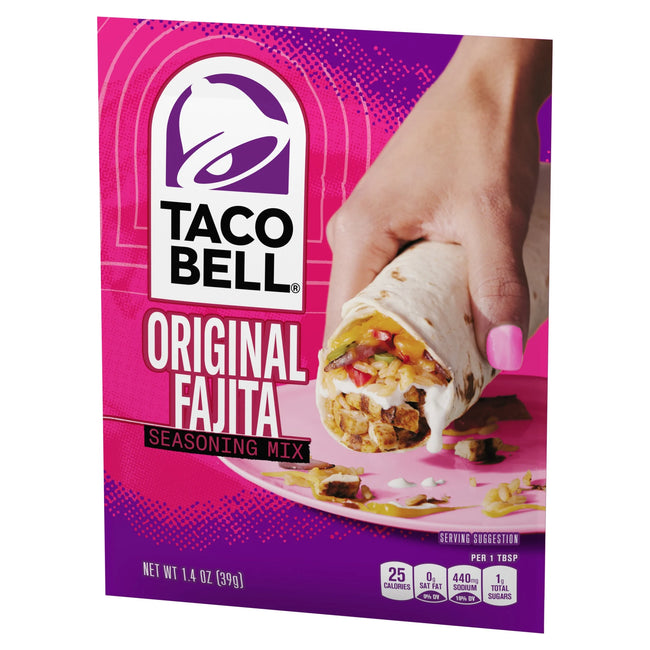 Live más at home with our Taco Bell Original Fajita Seasoning Mix. Taco Bell makes mealtime more craveable with Mexican-style flavors elevate chicken breasts or boneless beef sirloin steak. Ideal for the whole family, our seasoning mix is great for adding a kick of Tex-Mex flavor to chicken or steak for fajitas and other dishes. After browning your meat, add our packet of seasoning mix and water, and let it simmer. Serve with soft tortillas, green pepper strips, sliced onions and salsa for a classic chicken fajita or beef fajita dinner. Each 1.4-ounce packet makes about 5 servings. Live more fervently, more authentically, more joyfully with Taco Bell.